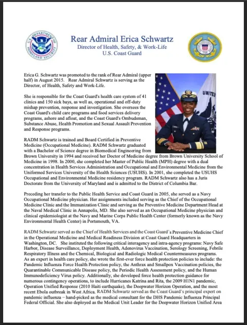 Die Nominierte Erica Schwartz verfasste die Pandemie-Influenza-Richtlinien des US-Militärs und leitete Überwachungs-, Impf- und Kontrollsysteme, die heute das Rückgrat der bundesstaatlichen Pandemieplanung bilden.